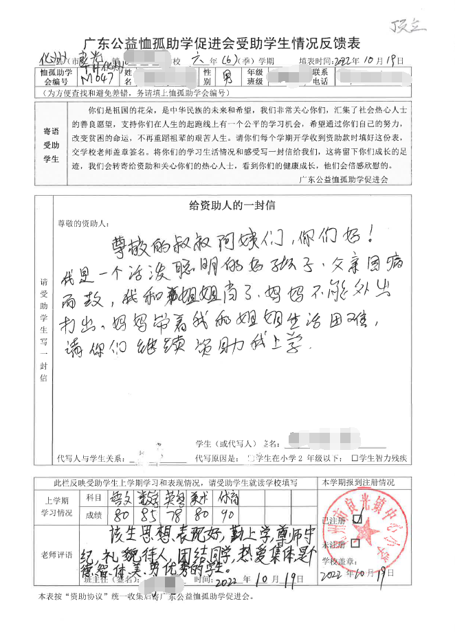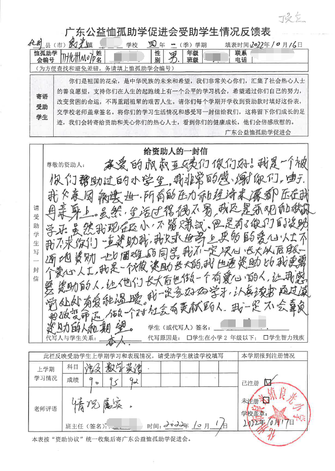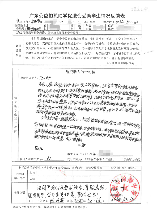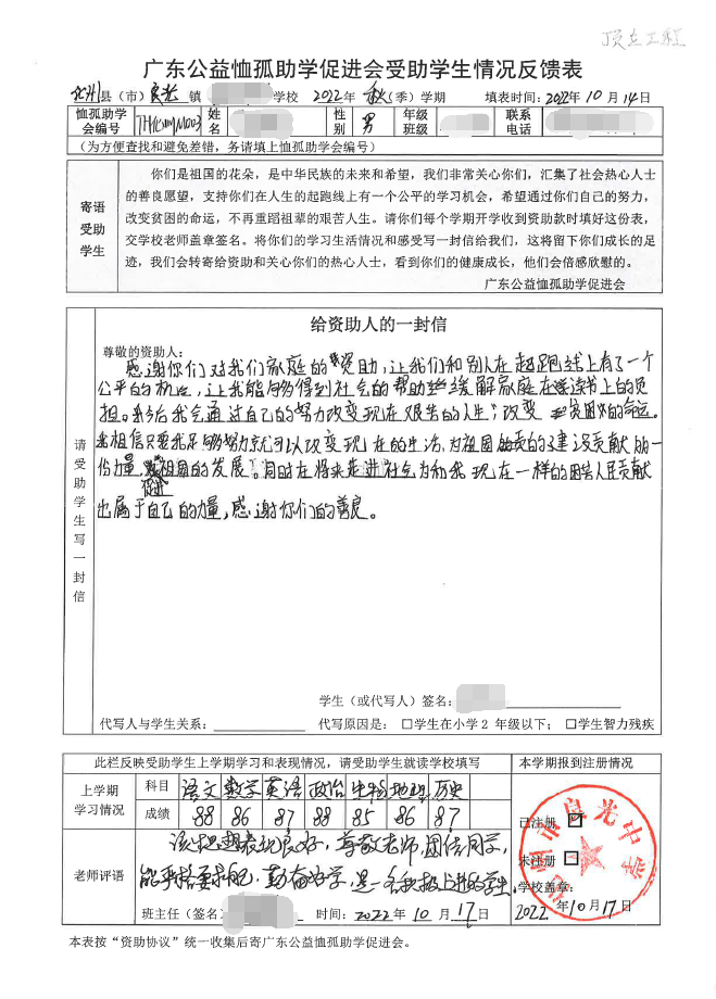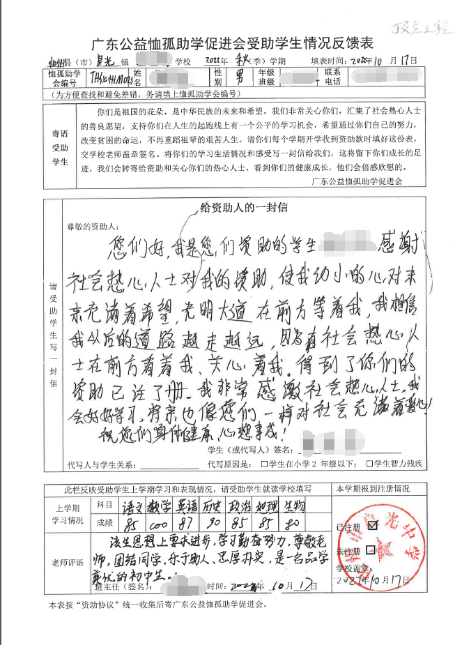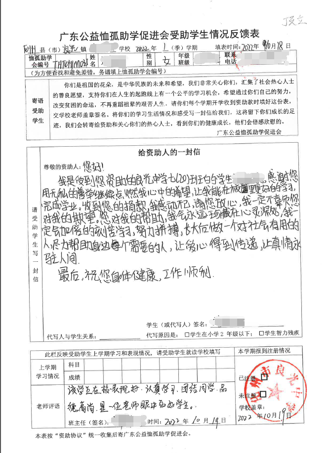 2022年7月,公司了解到广东公益恤孤助学促进会举办慈善助学活动之后,发起了公司内部慈善捐款活动,员工们积极参与,纷纷捐款,向有需要的学生奉献爱心,向他们表达一份关爱。也许完美官网_完美(中国)的爱心微不足道,但却缓解了他们在学业上一定程度的经济压力,改善了他们的学习和生活环境,也给他们带来了希望。近期,广东公益恤孤助学促进会将学生情况反馈表及受助学生对捐助人的一封信邮寄到公司,反馈了受助学生的学习生活情况,反馈表及信函里记录着受助学生对学习的热爱,也表达着他们对捐助人的感激之情,可以说完美官网_完美(中国)小小的举动给他们带来了莫大的支持。